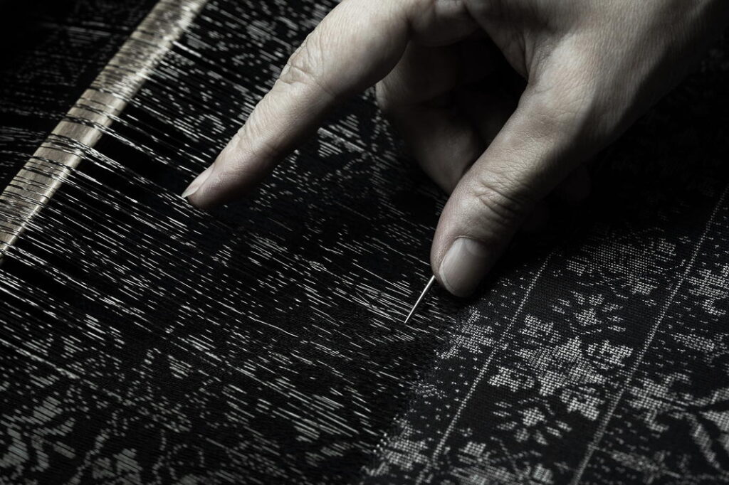 A そうですね、大島紬では、織り上げた際に正確な柄が自然に現れるよう、染色前に糸の配置を綿密に計算し、白く残す部分を一本一本括って染料が染み込まないようにします。この独特な絣の技法は世界的にも非常に希少で、これにより極めて緻密な絣柄が実現されます。こうして柄を糸に固定する重要な工程は「締めバタ」と呼ばれ、わずかなずれが生じるだけでも美しい柄は完成しません。